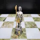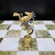 Поле шахмат выполнено из редкого и благородного оникса, сочетающего в себе оттенки белого и глубокого зеленого. Доска и фигуры, отлитые из бронзы, вручную расписаны серебром и золотом, придавая им неповторимый блеск и роскошь. Каждый элемент выполнен с исключительным вниманием к деталям, что делает эти шахматы настоящим шедевром.
